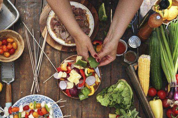 Mientras calientas el horno, la parrilla o la plancha para cocer la carne, pica el resto de las verduras y la lechuga, mezcla y reserva. Podrás poner el aliño al momento de servir.