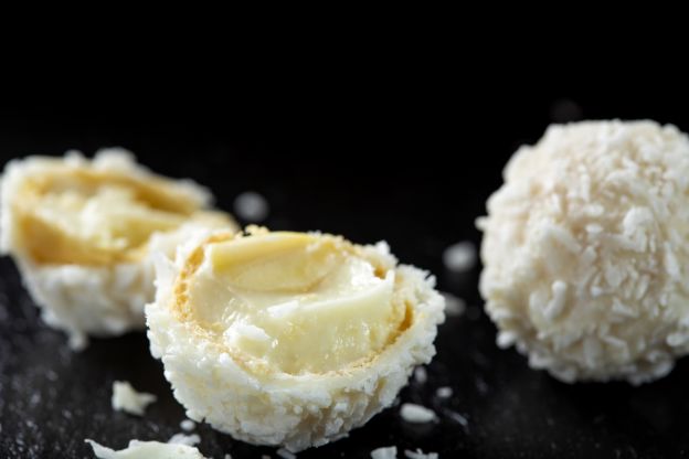 4. Forma bolitas con la preparación, pon una almendra en el centro, luego cierra bien cada chocolate. Ahora pásalos por el coco rallado.