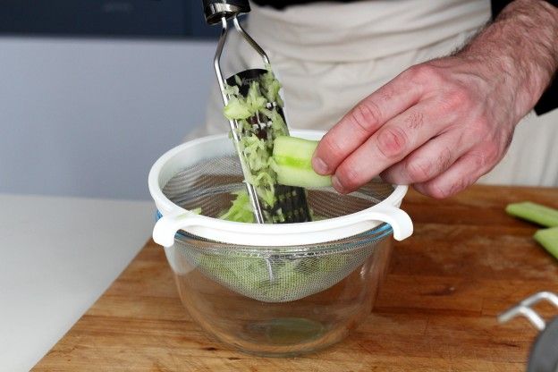Lavamos el pepino, lo pelamos y lo rallamos en un rallador por la parte más fina.