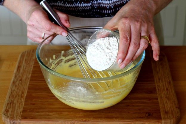 Añade la harina, mezcla, añade la mantequilla derretida y vuelve a mezclar.
