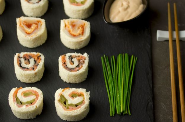 Si tienes antojo de sushi pero no quieres pasar horas en los preparativos, debes probar esta alternativa con pan de molde.  Sólo necesitas hacer un rectángulo con rebanadas de pan (por ejemplo de 2 x 3) y aplastarlo con un rodillo hasta que se peguen. Coloca en tiras tu relleno favorito, como queso crema, pepino, surimi, salmón ahumado o aderezo picante. Enrolla con firmeza (puedes colocar el pan sobre plástico enrollado para que sea más fácil) y corta en rebanadas. También puedes colocar láminas de alga dentro o fuera de tu rollo. Quedan deliciosos, son fáciles de comer y puedes acompañarlos con mayonesa picante o un aderezo cremoso con ajo y hierbas.