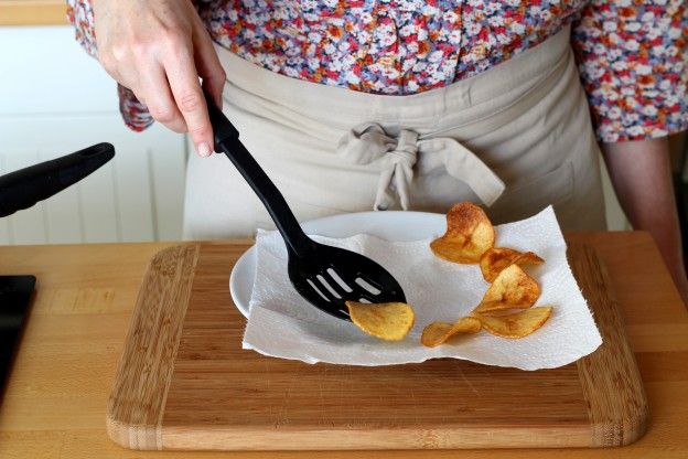 Según vayas friendo las chips, ve colocándolas sobre un plato con papel de cocina.