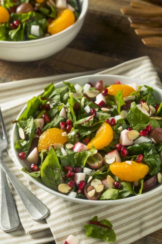 2. Aparte, pelamos y cortamos en trozos la naranja y la manzana. Lavamos y cortamos las uvas por mitad, retirando la semilla de ser necesario. Pelamos la granada y sacamos los granos.