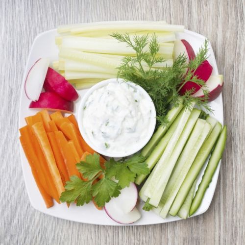 Una idea genial para un aperitivo saludable. Mezcla 1 taza de yogurt griego con ajo en polvo, sal, pimienta, jugo de limón, una pizca de mostaza y hierbas frescas como cebollín, perejil o eneldo. Sirve con palitos de zanahoria, apio, pimiento y rábano.