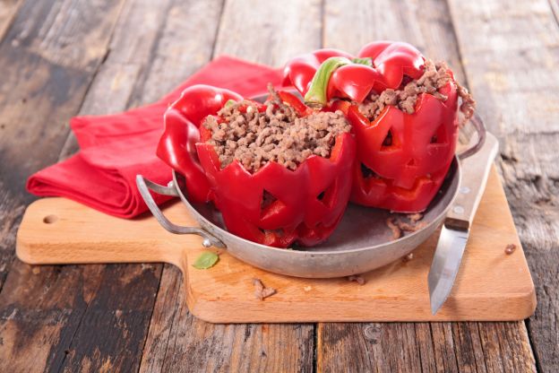 El secreto especial de estos pimientos rellenos está en el corte de calabaza de Halloween que los vuelven aún más especiales (sin que dejen de ser nutritivos). Realiza los cortes con un cuchillo para detallar.