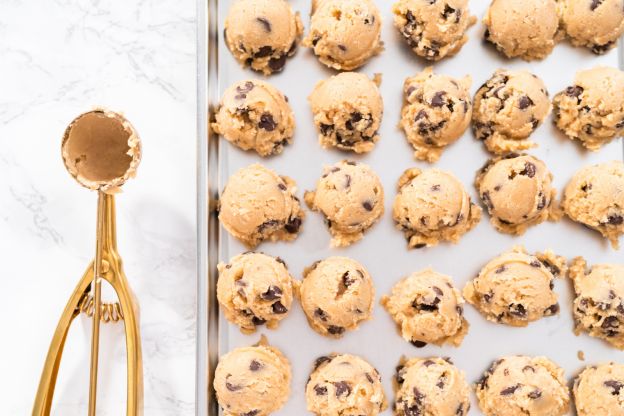 Ahora que las bandejas de galletas están forradas, asegúrate de no sobrecargarlas. La masa se expande considerablemente durante el proceso de cocción, por lo que las cookies necesitan espacio para extenderse, sin que se peguen entre sí. El exceso de espacio en la bandeja también impide que el aire caliente circule alrededor de las galletas, lo que dificulta la obtención de esos bonitos bordes crujientes en todo el contorno. Para obtener los mejores resultados, manténlas separadas al menos 5 cm entre sí.