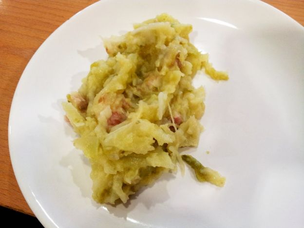 Este es un plato hecho sobre la base de hervir patata y col y después triturar y mezclarlo todo. Se añade tocino y algún tipo de manteca para freír la mezcla.