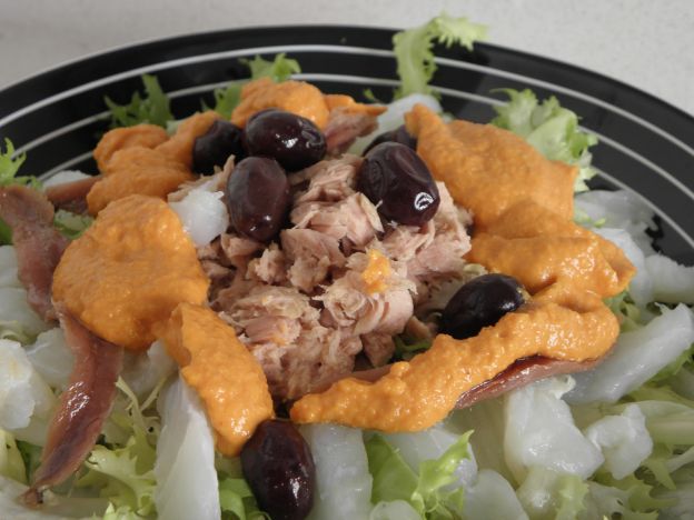 Una ensalada hecha con escarola anchoas, atún y bacalao. Todo acompañado por una salsa elaborada a partir de almendras y avellanas tostadas, miga de pan con vinagre, ajo, aceite, sal y ñora como ingrediente característico.