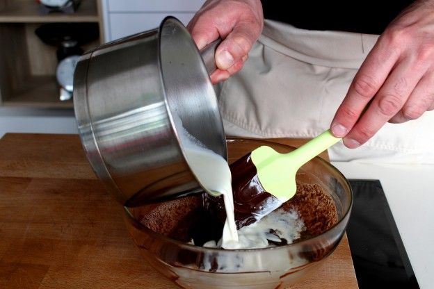 Vamos a echar la mezcla del cacito en el bol donde tenemos el chocolate derretido en tres veces.