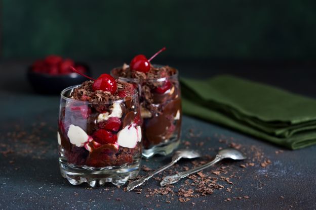 Estos vasitos son una versión tramposa del clásico postre selva negra, y los preparas mezclando trozos de bizcocho de chocolate con nata montada y mermelada de cereza. Decora con cerezas frescas y chocolate rallado.