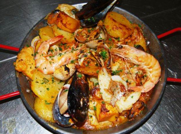 A simple vista puede parecer una paella, pero no lo es. Se trata de un plato de patatas asadas con mariscos a la plancha. Para morir de placer.