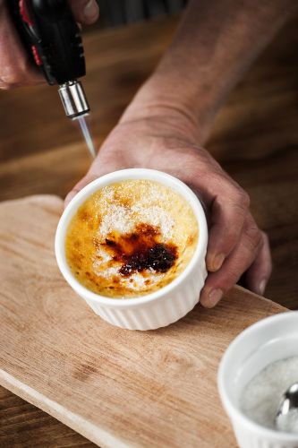 Cuando la crème brulée ya no tenga un color marrón caramelo sino un color negro azabache, raspa con cuidado la capa carbonizada y sazona con canela, cacao o ralladura de limón.