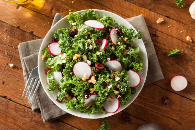 El calor veraniego hace que sea recomendable reponer vitaminas y minerales con más frecuencia que de costumbre. Esta ensalada de col rizada, rábano, arándanos y nueces te aportará todo lo que necesitas y más.