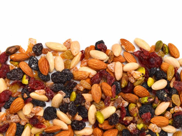Nunca subestimes las propiedades de los frutos secos como snack. Las nueces, almendras y cacahuates son ricos en fibras, grasas saludables y proteína, un combo ideal para mantenerte satisfecho por más tiempo. Si los mezclas con fruta deshidratada, tendrás además vitaminas y azúcares para mantenerte con energía. Prepara tu propia mezcla en casa con estos ingredientes: