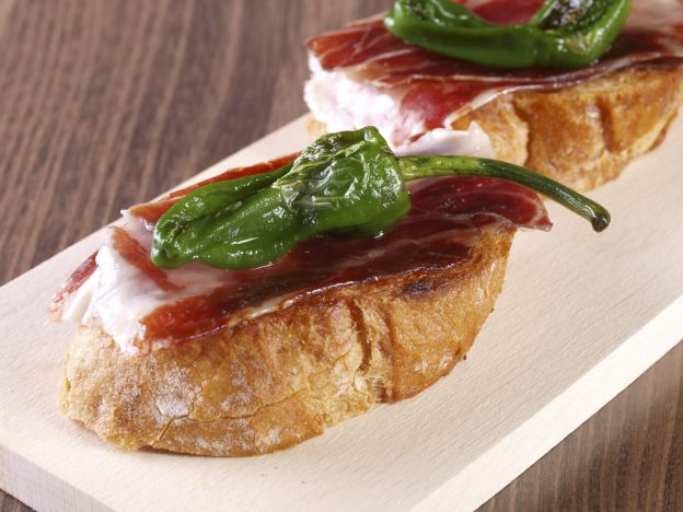 4. Arma tus tapas colocando los trozos de jamón y un pimiento de padrón para coronar, y sirve de inmediato.