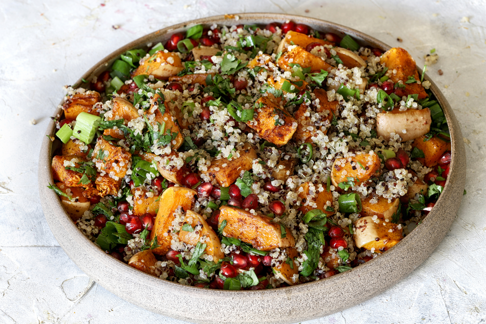 Esta ensalada es perfecta para hacer la transición entre temporadas. Combina suave calabaza asada con granadas, jalapeño fresco y hierbas aromáticas. Además, puedes llevarla al trabajo sin problemas, para una comida saludable y ligera.