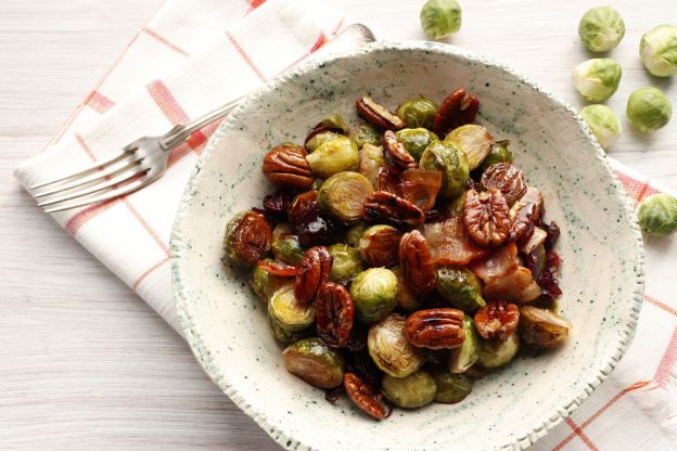 - Cuando las coles estén glaseadas y doraditas, pasar a una fuente y mezclar con las nueces y el bacon.
