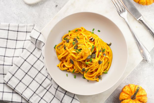 Añade el puré de calabaza, la bebida de avena, el vinagre y las especias y remueve hasta que esté suave. Si la salsa está demasiado espesa, añade un poco de agua de la pasta.