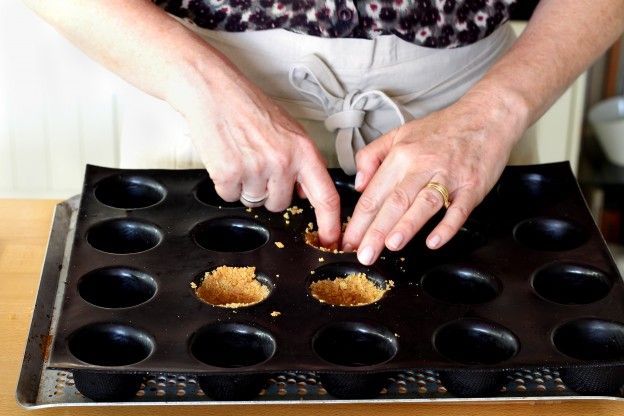 Si nuestro molde no es de silicona, podemos poner un poquito de film transparente en cada hueco antes de poner la base de galleta, porque así será más fácil cuando vamos a desmoldar.