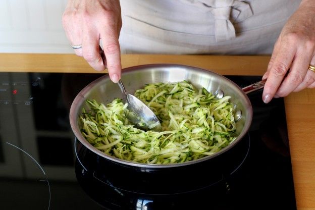 Rehoga el calabacín rallado con una cucharada de aceite de oliva durante 2 minutos.