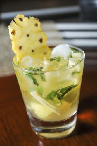Con un mortero especial para preparar cócteles, vamos a ir aplastando poquito a poquito todos los ingredientes para que se mezclen bien los sabores. Añadimos los daditos de piña.