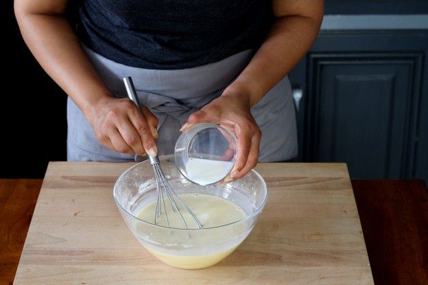 5. Mientras tanto, agrega en un tazón la nata espesa y la nata para montar y bate vigorosamente para que esponje.
