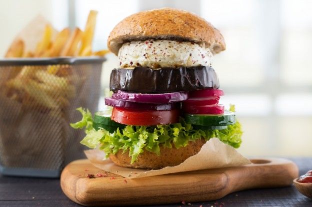 Prepara esta hamburguesa con pan integral, remolacha,tomate y berenjena (prepárala en la sartén con un chorrito de aceite de oliva) y un pedacito de queso tipo Picodon. Completa, original y consistente.