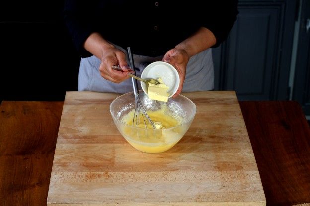 Añade la mantequilla en trocitos y mezcla bien para que se reparta correctamente por toda la mezcla.