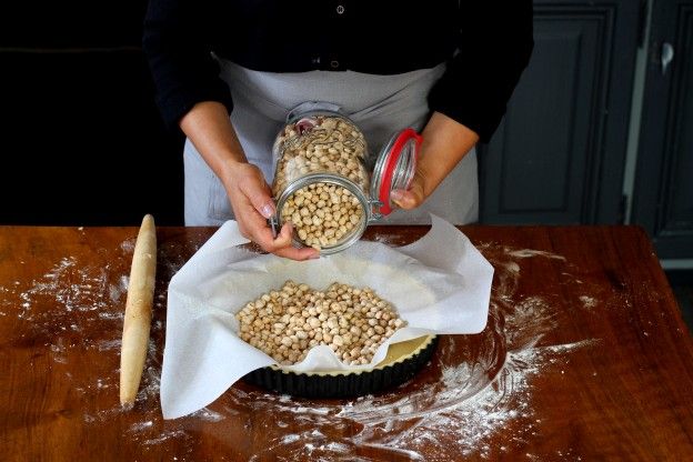 Cubre la masa con una hoja de papel sulfurizado y echa encima unas judías para que durante la cocción, la masa no se hinche.