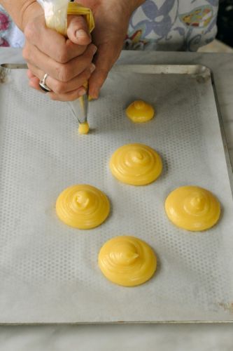 Echa la pasta de choux en una manga pastelera y ve formando círculos sobre el papel sulfurizado. Hornea a 180ºC durante 25 minutos los choux pequeños y 30 minutos los grandes. A la mitad del tiempo del horneado, abre el horno rápidamente para que salga el vapor. Cuando los choux estén dorados, sácalos de horno y déjalos enfriar sobre una rejilla.