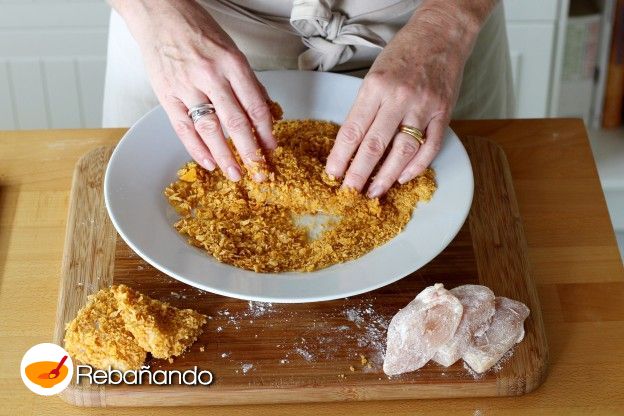Pasamos el pollo por el plato donde tenemos los Corn Flakes, dándole pequeños golpecitos para que se peguen bien.