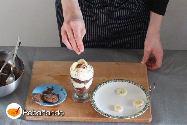 Justo antes de servir, decora la superficie de cada copa con galletas desmigadas y un par de rodajas de plátano.