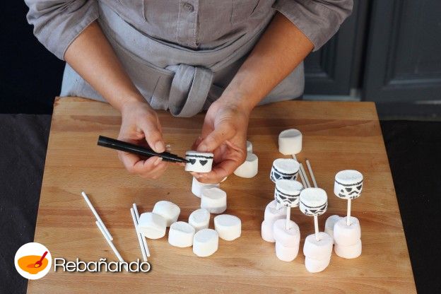 Dibujamos, siempre con el rotulador especial de repostería, dos triángulos pequeños hacia abajo y después los rellenamos.