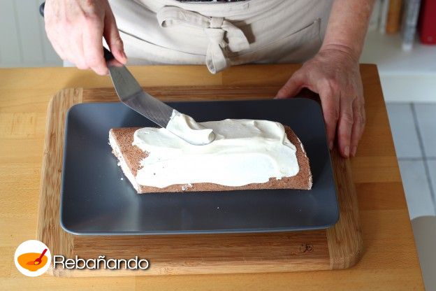 Colocamos el bizcocho en una bandeja de horno y lo cubrimos con una capa de crema.