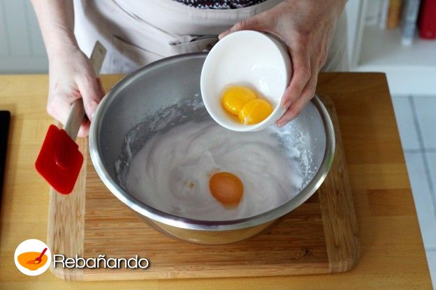 Añadimos las yemas y batiremos todo con mucho cuidado usando una espátula de silicona.
