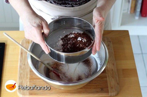 En el bol de las claras echaremos la harina, la maizena y el cacao después de pasarlos por un tamiz. Después lo mezclaremos todo hasta que los ingredientes queden bien incorporados.