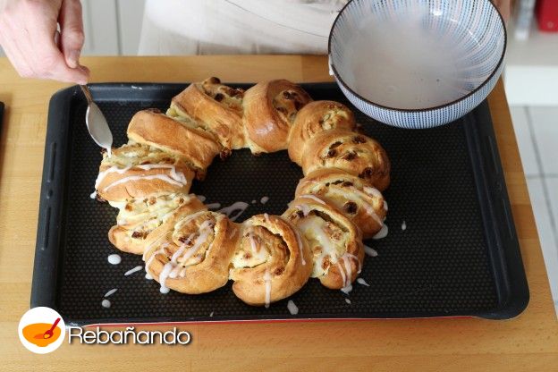 Cuando nuestro roscón esté doradito, lo sacaremos del horno y le pondremos el glaseado por encima.