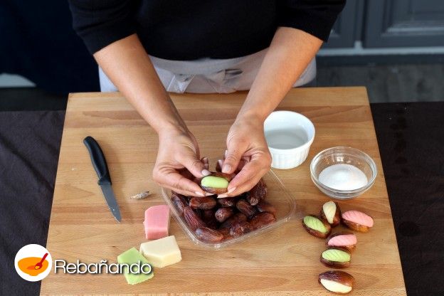 Rellena los dátiles con la pasta de almendras del color que prefieras.