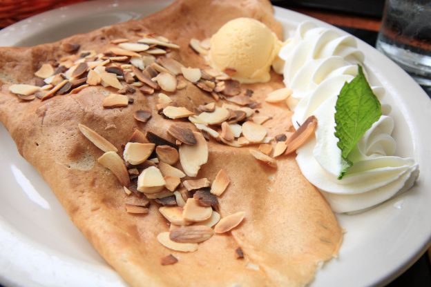 Coloca 2 bolas de helado de vainilla sobre el crepe, añade la nata montada, almendras en láminas y salsa de chocolate o chocolate fundido.
