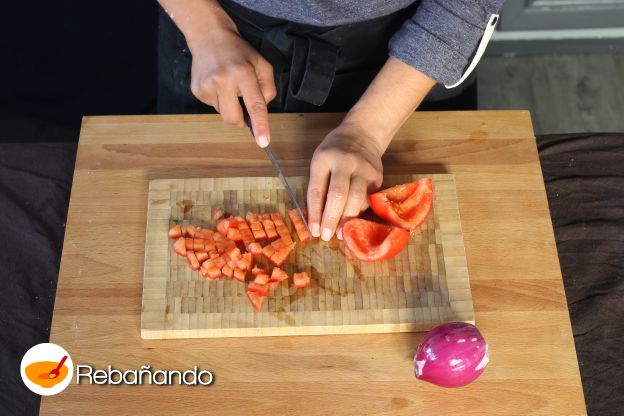 Lava el tomate y córtalo en daditos. Pela la cebolla y córtala.