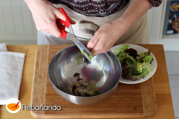 Mientras las tortillas se hornean, corta las hojas de lechuga en pequeños trozos en un tazón.
