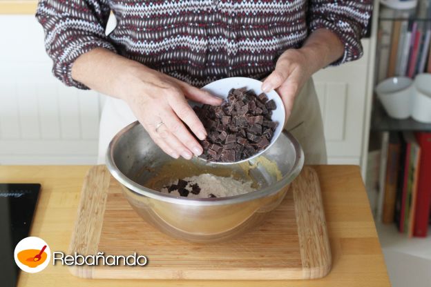 Toma el chocolate que habías cortado en trozos e incorpora 3/4 partes de lo que habías picado a la mezcla. Reserva el 1/4 restante para después.