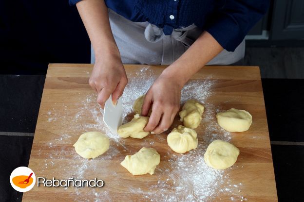 Enharina la superficie en la que vas a trabajar y saca la masa del tazón. Divídela en porciones de 50 g aproximadamente.