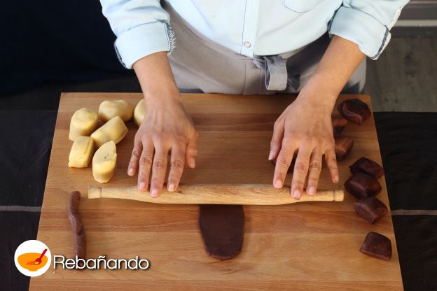 Ahora, extiende una porción de masa marrón oscuro para formar un óvalo un poco más grande que el anterior.