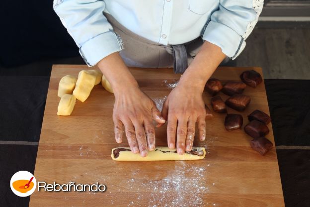 Enrolla todo para obtener un cilindro de tres capas. Repite los pasos anteriores con las demás porciones de masa.