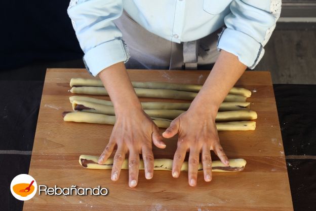 Cuando tengas 6 cilindros de 3 capas cada uno, extiéndelos con las manos para obtener tiras largas.