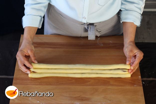 Junta las seis tiras de masa para obtener una sola, más ancha.
