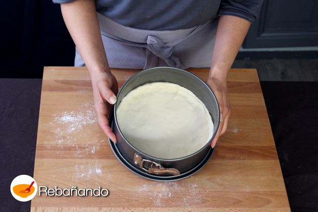 La segunda masa la extenderemos sobre sobre el fondo de un molde para tartas y cortaremos los bordes sobrantes.