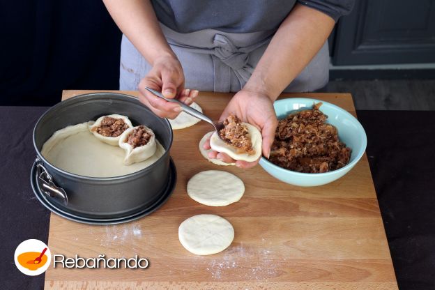 Metemos una cucharadita del relleno que ya tenemos preparado en cada círculo de masa.