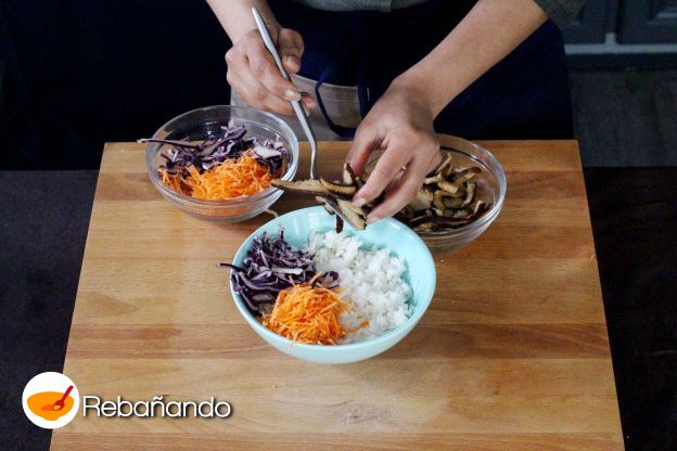 Escápate a Corea con este delicioso Bibimbap de gambas, setas y vegetales
